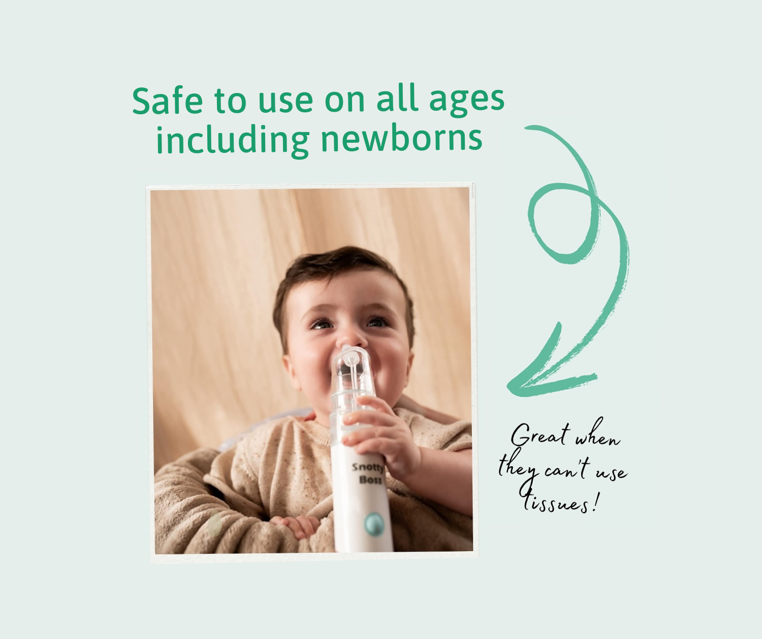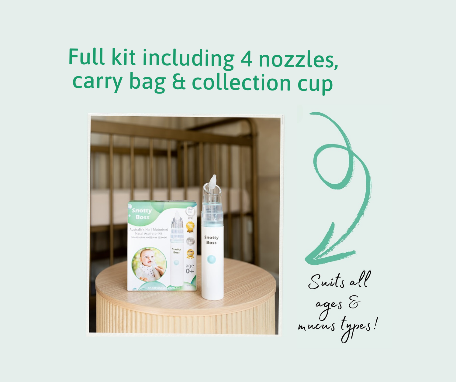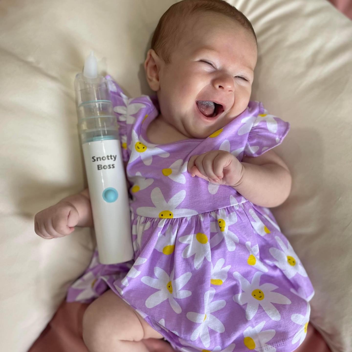 The Snotty Boss is Australia’s #1 motorised nasal aspirator, clearing little noses in seconds. TGA-approved, reusable, and easy to clean, it’s a safe, non-medicated way to relieve congestion and keep your baby comfortable day or night. After launching in Australia in 2020 and becoming the go-to cult baby product, we now ship worldwide.