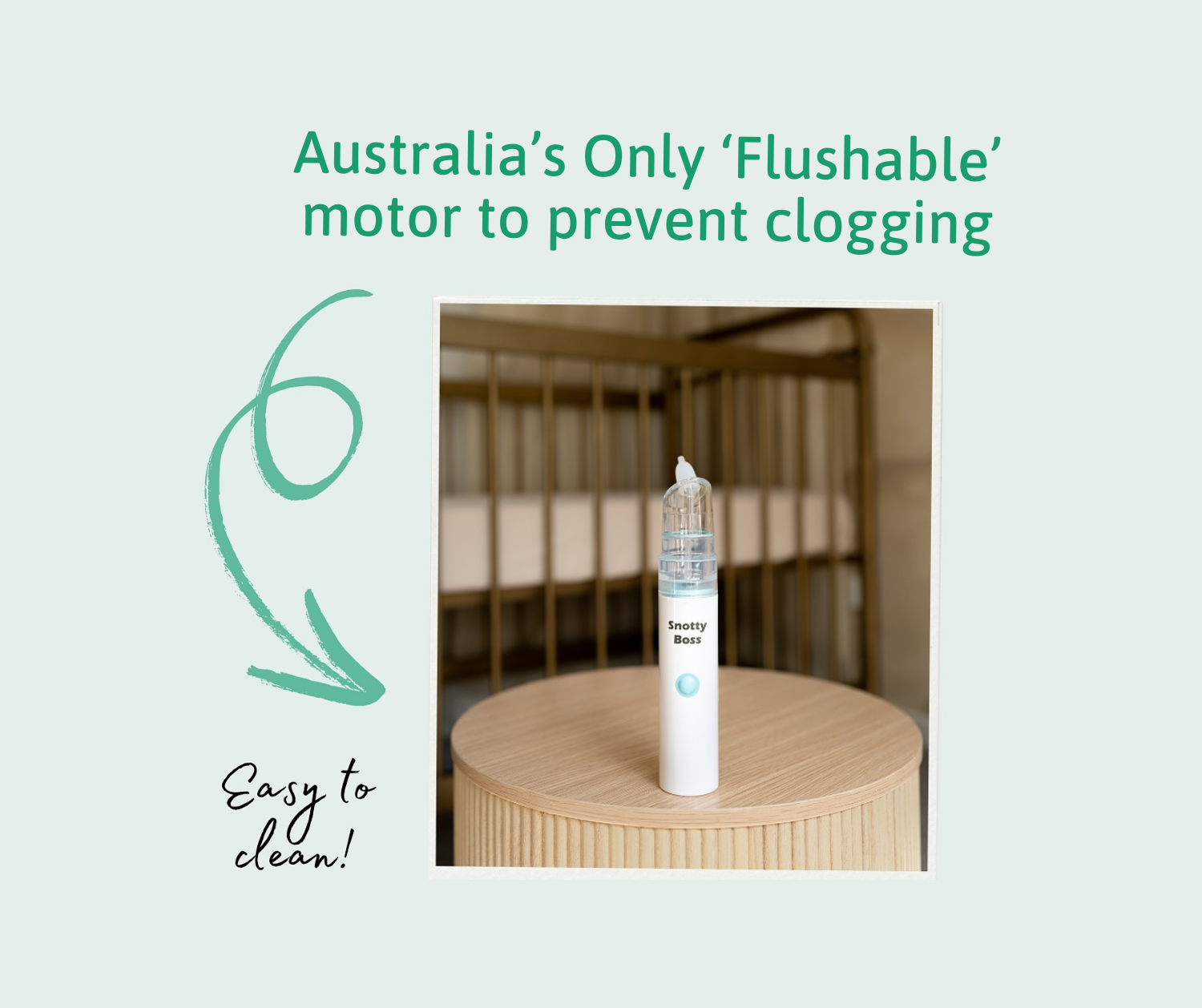No more clogged or messy devices. Featuring Australia’s only flushable motor, Snotty Boss is hygienic, reusable, and simple to clean after every use – keeping it safe for your child and stress-free for you.